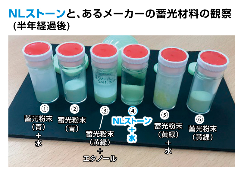 「NLストーン」と、あるメーカーの蓄光材料(粉末)の観察(半年経過後)を動画でご案内